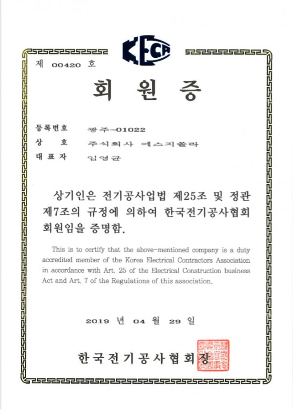한국전기공사협회회원증 페이지 정보 작성자최고관리자 댓글 0건 조회 897회 작성일 19-09-02 16:48 본문 (주)에스지쏠라 한국전기공사협회회원증 목록 이전글전기공사업등록증 19.09.02 다음글사업자등록증 19.09.02 댓글목록 댓글목록 등록된 댓글이 없습니다.