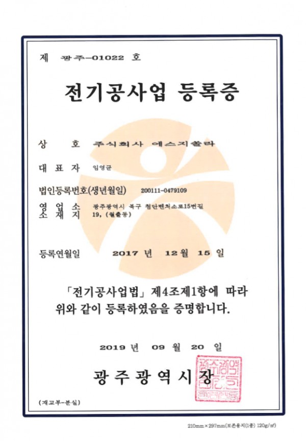 전기공사업등록증 페이지 정보 작성자최고관리자 댓글 0건 조회 787회 작성일 19-09-02 16:50 본문 (주)에스지쏠라 전기공사업등록증 목록 이전글벤처기업협회정회원증 19.09.02 다음글한국전기공사협회회원증 19.09.02 댓글목록 댓글목록 등록된 댓글이 없습니다.